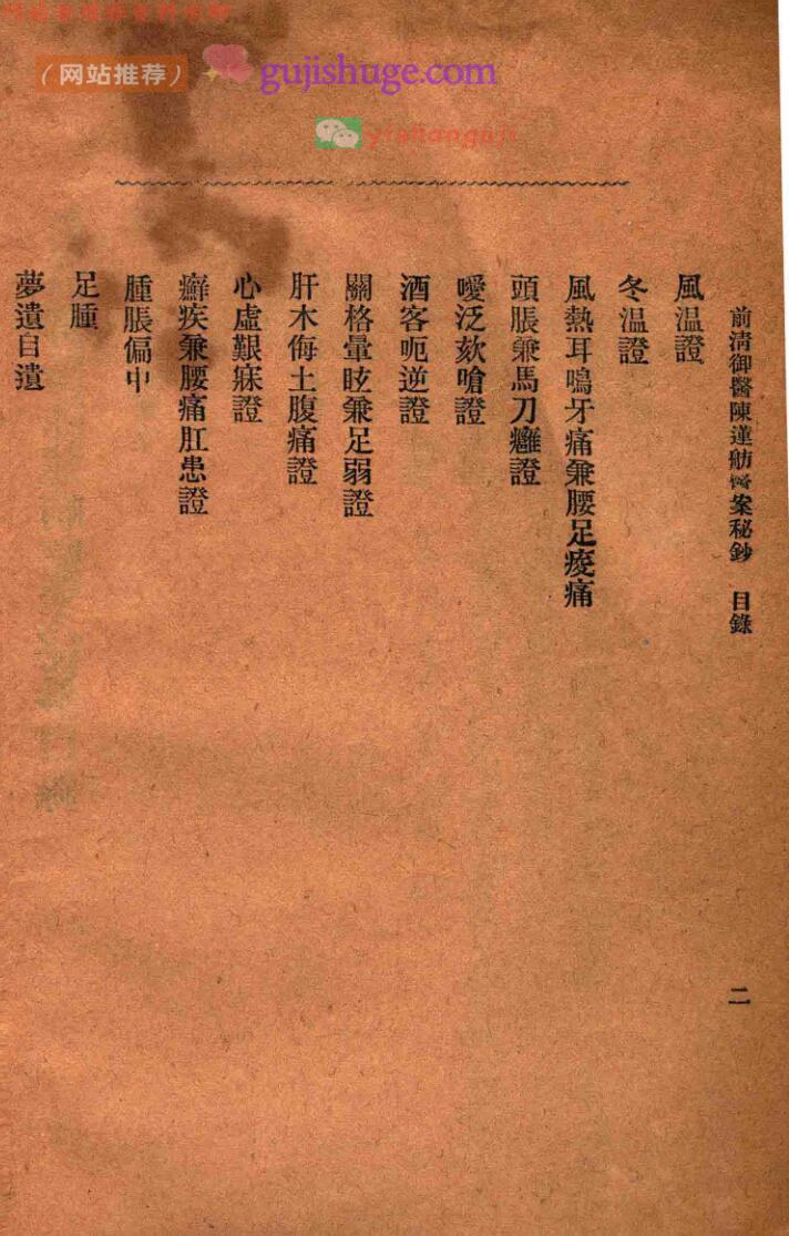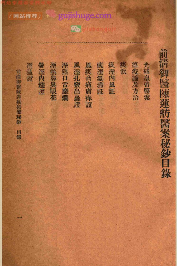 内容有:光绪皇帝医案、瘟疫论及方治、痰饮、风温證、冬温證、酒客呃逆證、肿胀偏中、足腫等等。