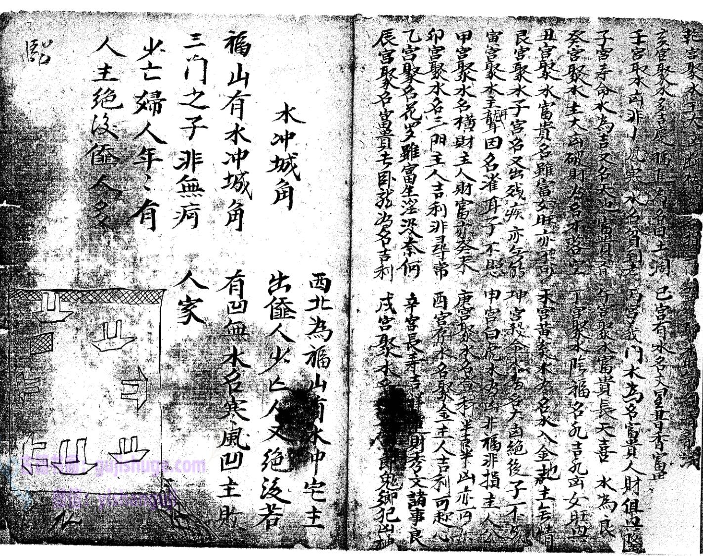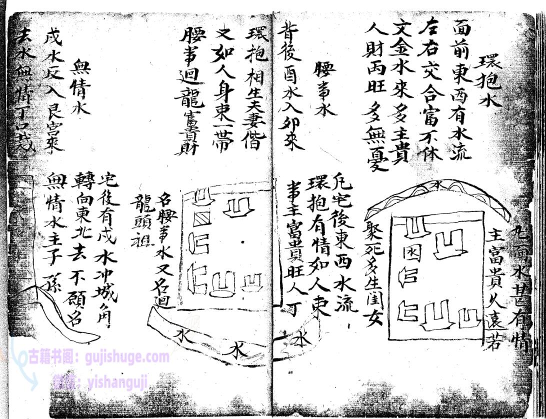 论水方位,凡水来者有吉凶,二十四方各分阴阳子癸丑山属阴以阳论之,艮寅卯乙辰己丙皆为阳…………………论聚水方位,水冲城角图例,箭射左路,阳宅外局断,等等